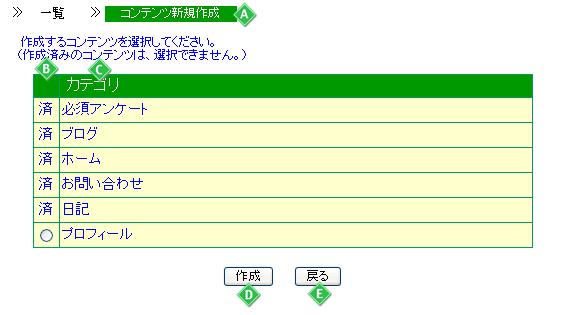 作成するコンテンツの選択(すでに作成しているものは「済」と表示)。